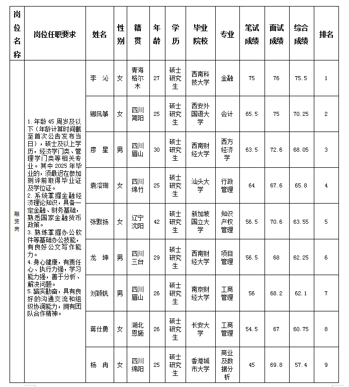 【公開招聘】綿陽金控投資管理有限責(zé)任公司關(guān)于招聘融資崗測試成績的公示
