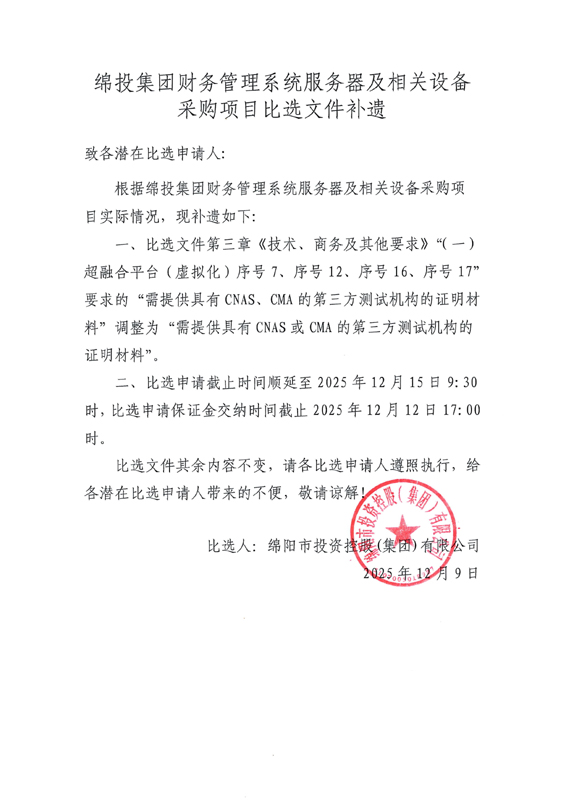 綿投集團(tuán)財(cái)務(wù)管理系統(tǒng)服務(wù)器及相關(guān)設(shè)備采購項(xiàng)目比選文件補(bǔ)遺