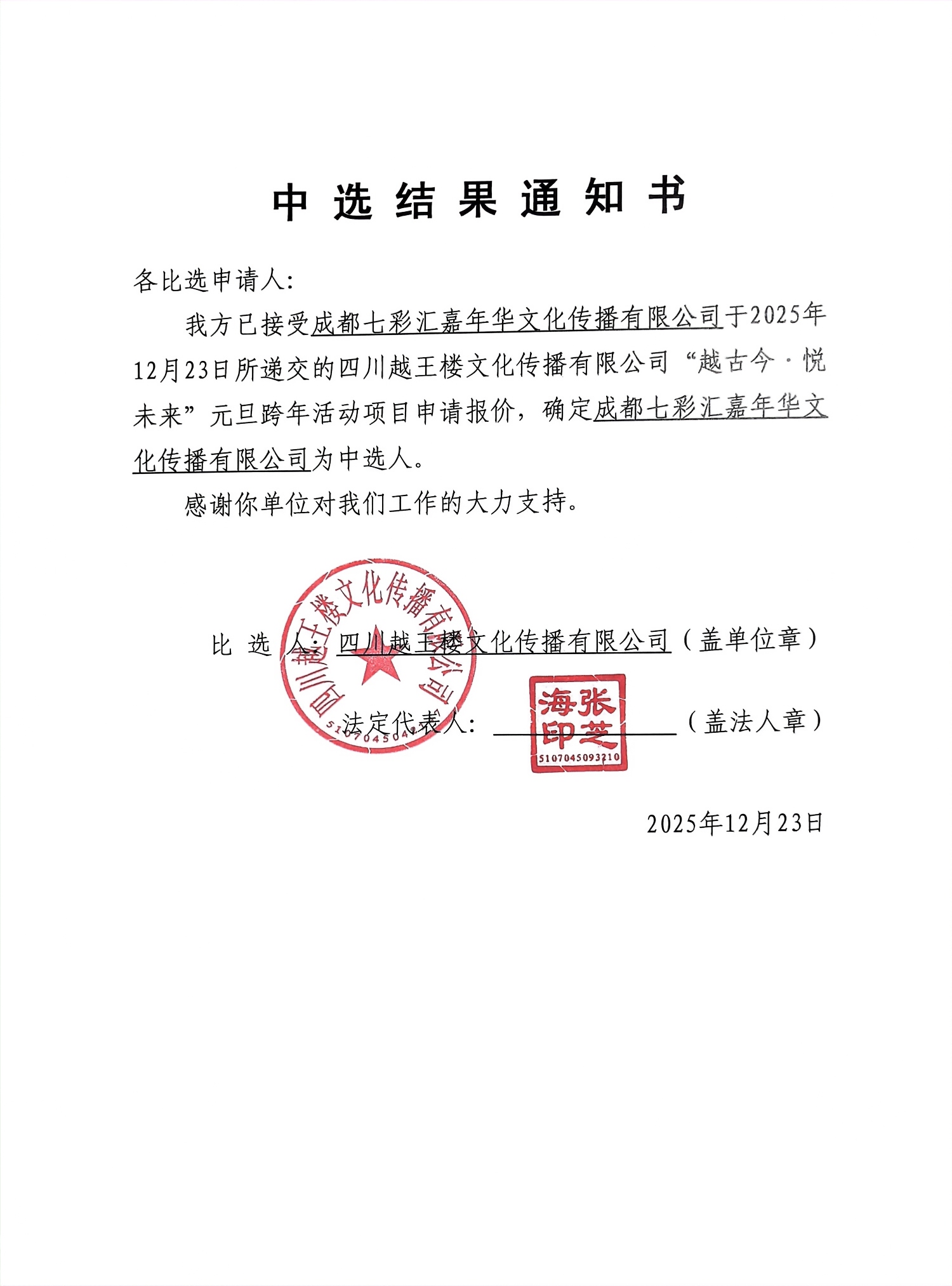 四川越王樓文化傳播有限公司“越古今·悅未來”元旦跨年活動項目中選結果公告